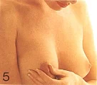 Betrachten Sie vor dem Spiegel mit am Körper anliegenden Armen Ihre Brust und suchen Sie dabei aufmerksam nach einer kürzlich eingetretenen Veränderung des Umfanges, der Form, des Aussehens der Haut oder der Brustwarzen.